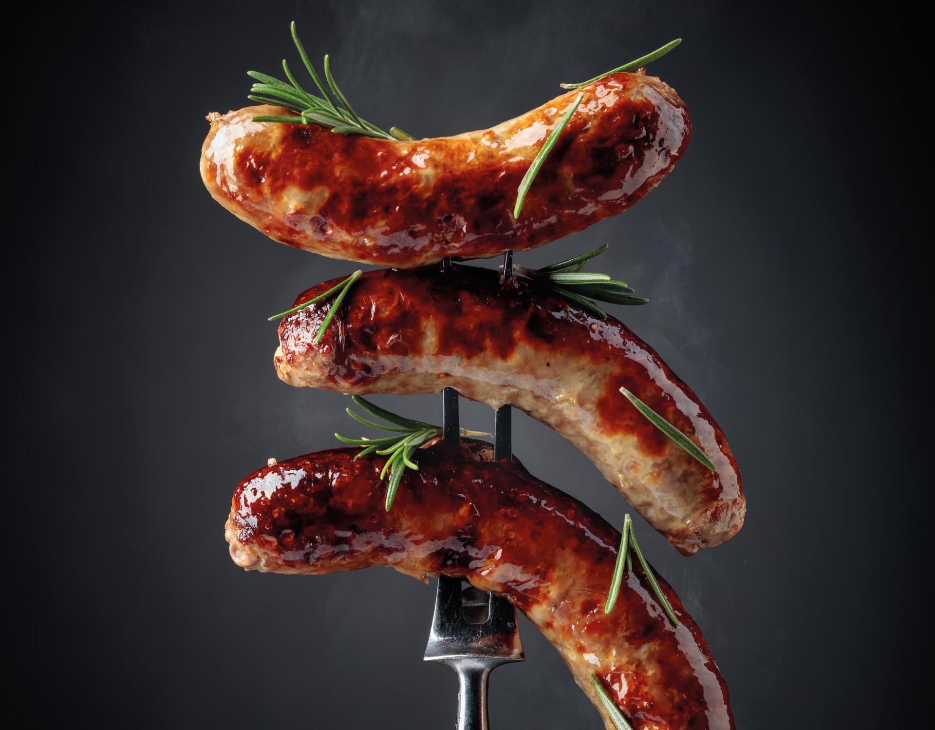 frische, gegrillte ilal. Bratwurst auf Rosmarinkartoffeln mit geräuchertem Mozzarella überbacken an Rucolasalat